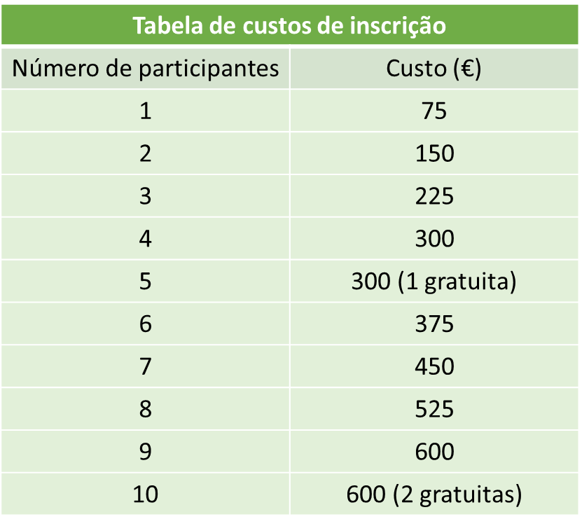Cada grupo de 5 participantes da mesma instituição tem direito a uma inscrição gratuita.