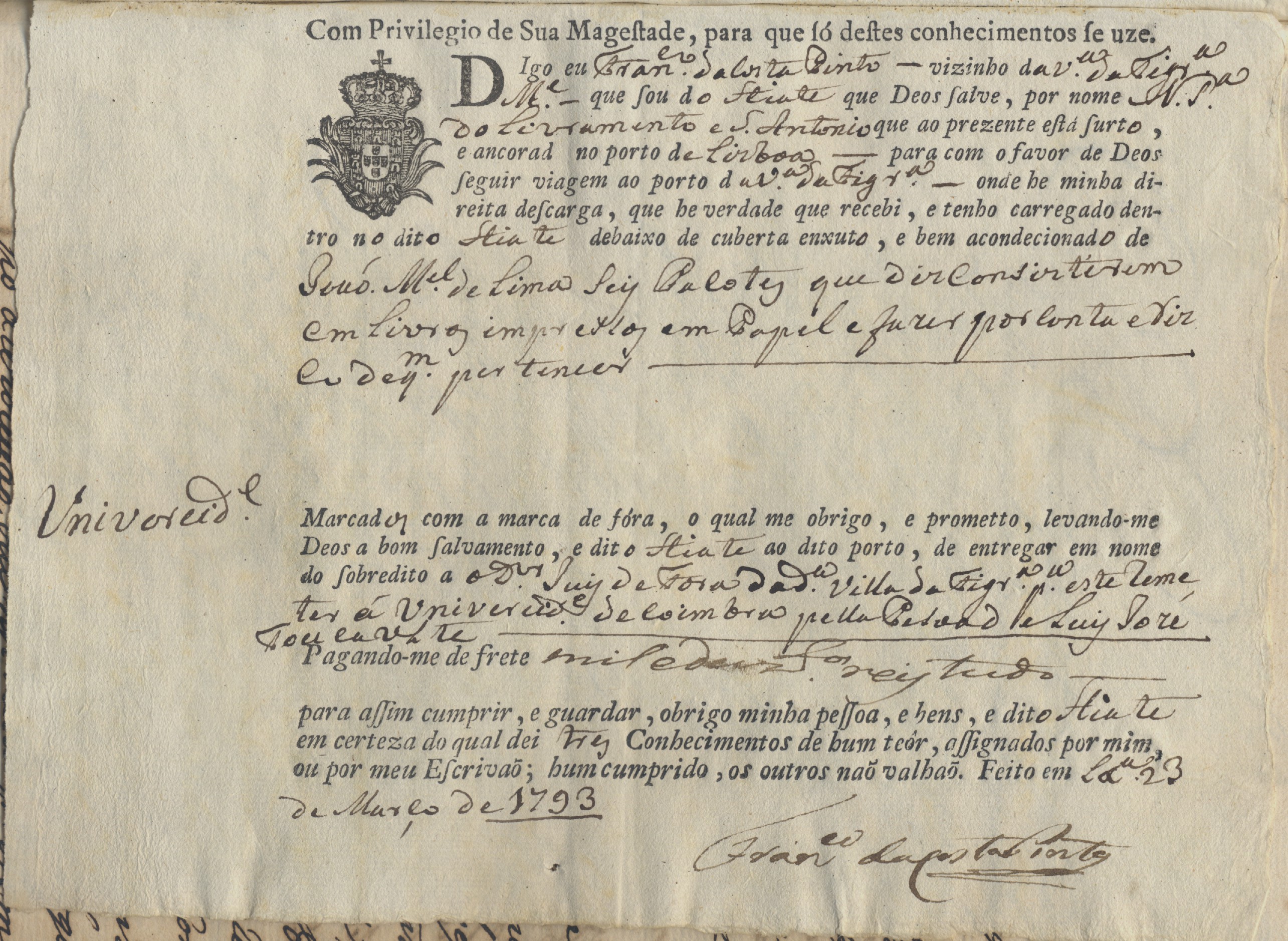 Este pequeno documento é o que se chamava um “conhecimento de embarque”. Nele se dá conta do embarque que foi feito, de seis pacotes com livros, para Coimbra, expedidos de Lisboa, por João Manuel de Lima, procurador da Universidade.
