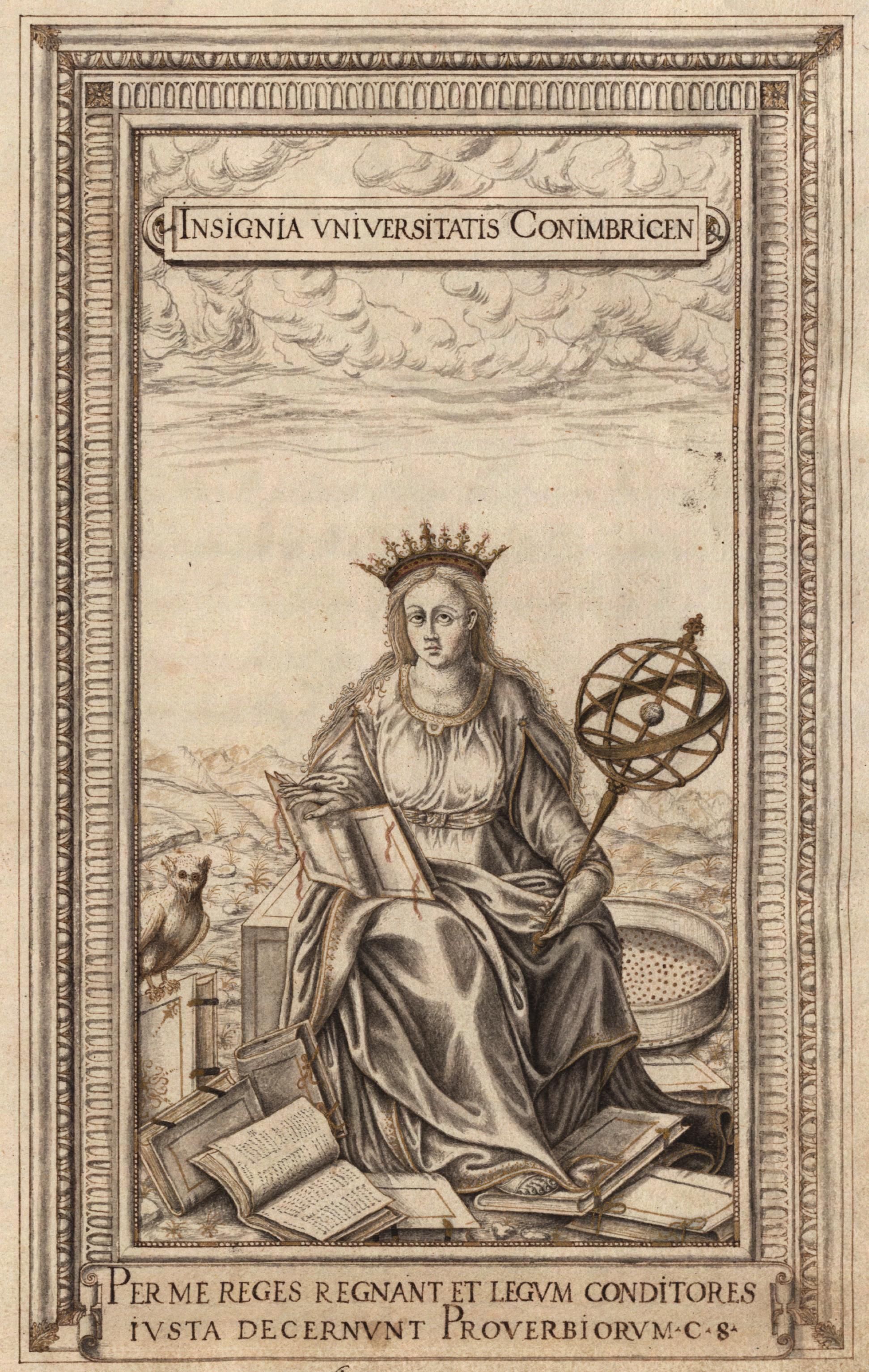 A folha que sucede à página de título e antecede o texto do manuscrito dos Estatutos Filipinos da Universidade (1597) apresenta este belo desenho a grafite, com pequenos apontamentos a dourado, com letras e contornos a tinta sépia.