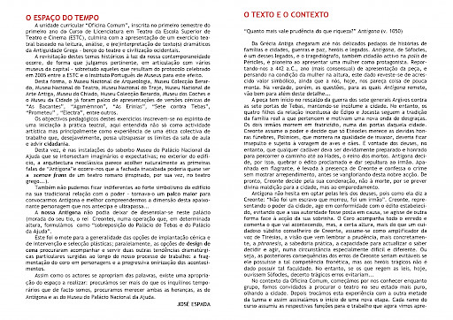 | Atores | Ana Sampaio (Coro) André Fernandes (Creonte, Coro) Bernardo Chatillon (Coro) Bernardo Chatillon (Creonte) Catarina Ribeiro (Ismena, Coro) Cátia Tomé (Ismena, Coro) Joana Messias (Antígona, Coro) Jorge Albuquerque (Coro) Jorge Neto (Coro, Hémon) João Dantas (Guarda, Coro) Lita Martins (Coro) Miguel Nunes (Coro, Creonte) Olívia Martins (Antígona, Coro) Rita Morais (Coro, Tirésias) Ruben Dias (Coro, Creonte) Sofia Sá (Coro, Mensageira) Susana Pereira (Coro, Antígona) |