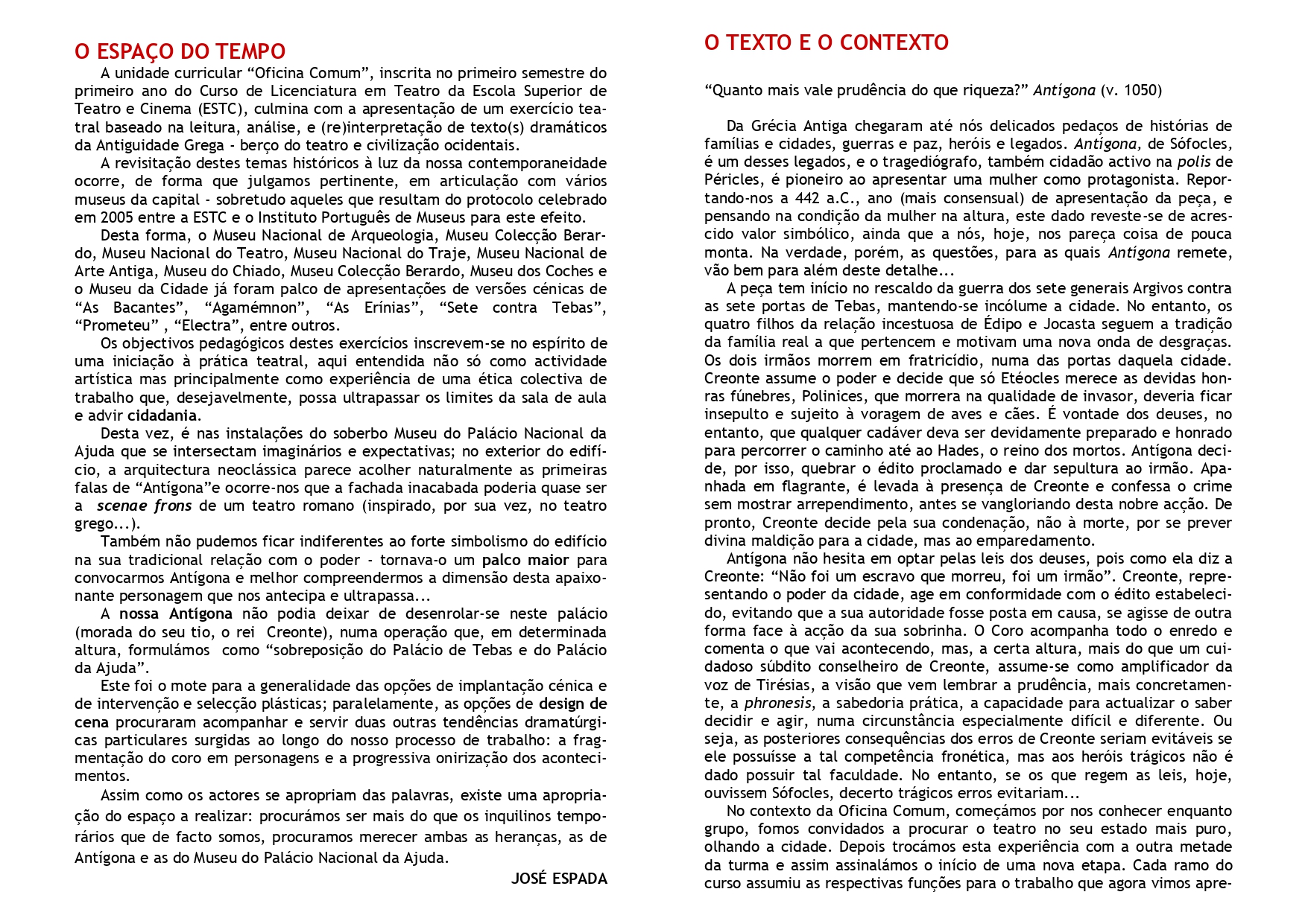 | Atores | Ana Sampaio (Coro) André Fernandes (Creonte, Coro) Bernardo Chatillon (Coro) Bernardo Chatillon (Creonte) Catarina Ribeiro (Ismena, Coro) Cátia Tomé (Ismena, Coro) Joana Messias (Antígona, Coro) Jorge Albuquerque (Coro) Jorge Neto (Coro, Hémon) João Dantas (Guarda, Coro) Lita Martins (Coro) Miguel Nunes (Coro, Creonte) Olívia Martins (Antígona, Coro) Rita Morais (Coro, Tirésias) Ruben Dias (Coro, Creonte) Sofia Sá (Coro, Mensageira) Susana Pereira (Coro, Antígona) |