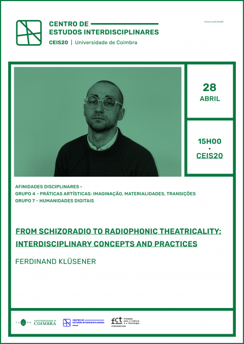 No próximo dia 28 de abril, pelas 15h00, terá lugar o seminário “From Schizoradio to Radiophonic Theatricality: Interdisciplinary Concepts and Practices” no âmbito das Afinidades Disciplinares, que contará com a participação de Ferdinand Klüsener, investigador e professor na Martin Luther University Halle-Wittenberg, na Sala de Seminários do CEIS20. Para assistir ao seminário é necessária inscrição.