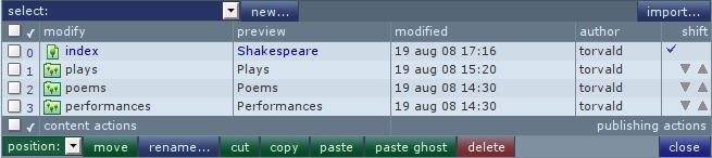 | Folder: the presentation of the information within a publication is structured with folders. They determine the visual hierarchy that a Visitor sees. Folders on the top level define sections of a publication, sub-folders define chapters, etc. | |