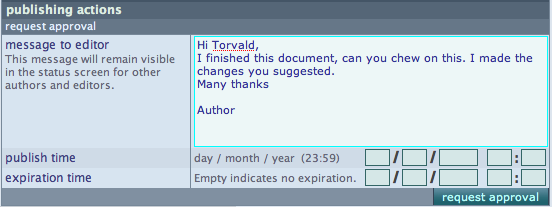 Note that when using the publish screen of a folder or publication, there is no message field and an automatically generated message is sent to the other party.