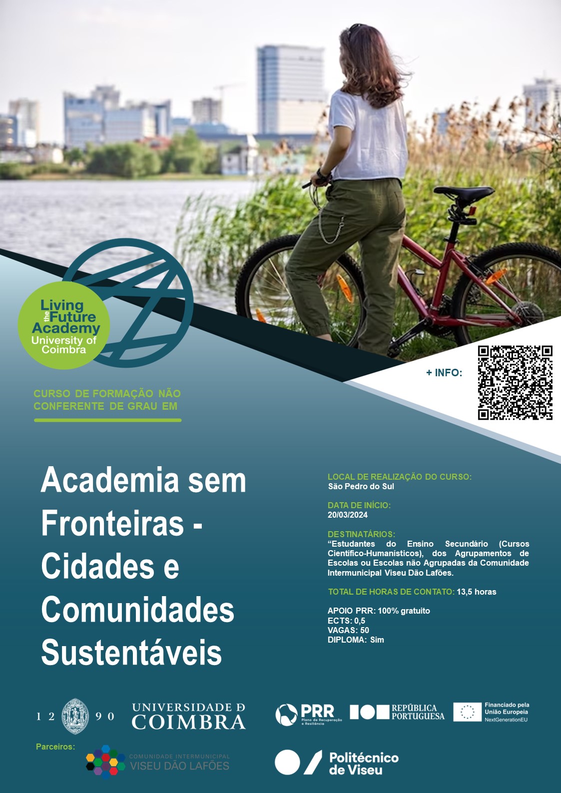 O curso "Academia Sem Fronteiras – Cidades e Comunidades Sustentáveis" vai realizar-se no âmbito do Bootcamp Academia Sem Fronteiras, para alunos do Ensino Secundário, de Cursos Científico-Humanísticos, de Agrupamentos de Escolas e de Escolas não Agrupadas do território "Comunidade Intermunicipal Viseu Dão Lafões".