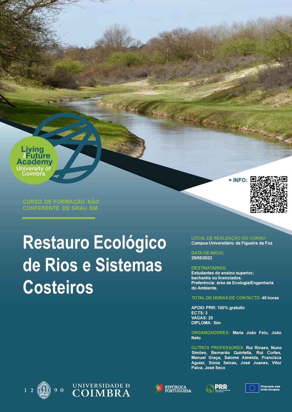 O curso de formação em "Restauro Ecológico de Rios e Sistemas Costeiros" cobre os aspetos ecológicos relacionados com diversos tipos de sistemas aquáticos: águas doces e sistemas costeiros. Aborda a informação e os métodos essenciais para o desenho de planos de implementação de medidas de restauro ecológico de massas de água. Os conteúdos são lecionados por investigadores com larga experiência na implementação da Diretiva Quadro da Água e responsáveis pelo desenvolvimento de métodos e protocolos oficiais e na sua intercalibração a nível Europeu. Serão cobertos tópicos essenciais à elaboração de projetos de restauro ou ao desenvolvimento de planos de medidas, ligados à hidrologia/hidráulica, biologia ou serviços dos ecossistemas em causa.