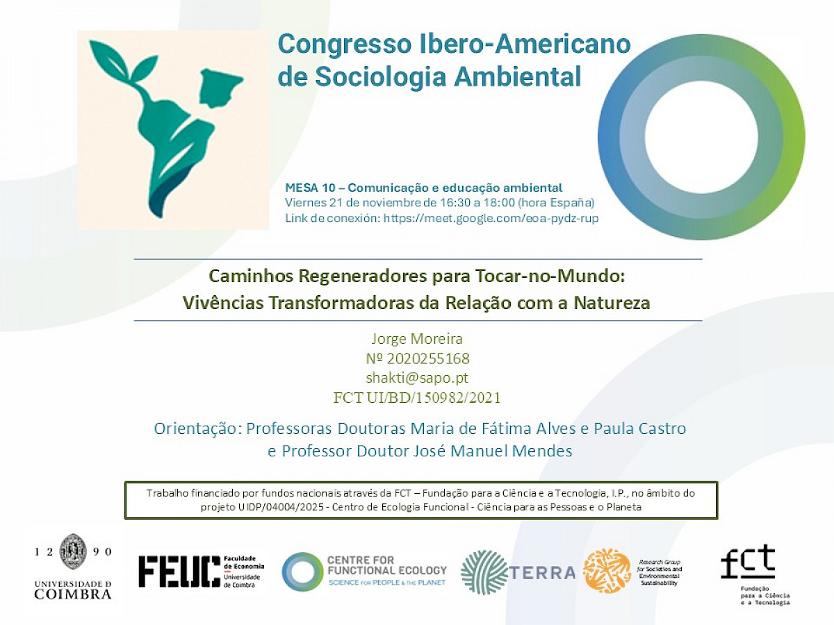 Moreira, J., Alves, F., Castro, P., & Mendes, J. M. (2025, novembro 21). Caminhos regeneradores para Tocar-no-Mundo: Vivências transformadoras da relação com a Natureza [Comunicação Oral]. 1.o Congresso Iberoamericano de Sociologia Ambiental / VII Encuentro Intercongresual del Comité de Investigación 21 «Sociología y Medio Ambiente» de la Federación Española de Sociología (FES), Universidade de Alicante, Online. https://web.ua.es/es/congreso-iberoamericano-socioambiental/