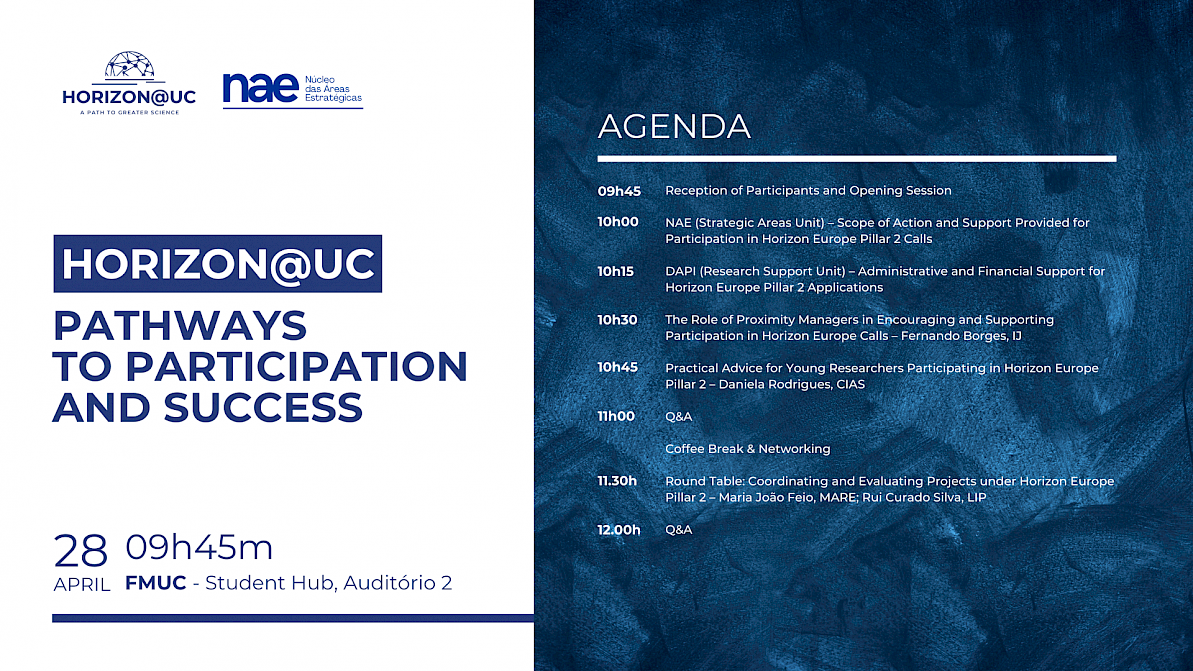 On April 28, 2025, the University of Coimbra (UC), through its Strategic Areas Unit (NAE), organized an internal session to support the submission of applications for Pillar 2 of Horizon Europe. The event, part of the Horizon@UC initiative, had the main objective of exploring pathways to participation and success in pillar 2 of Horizon Europe.