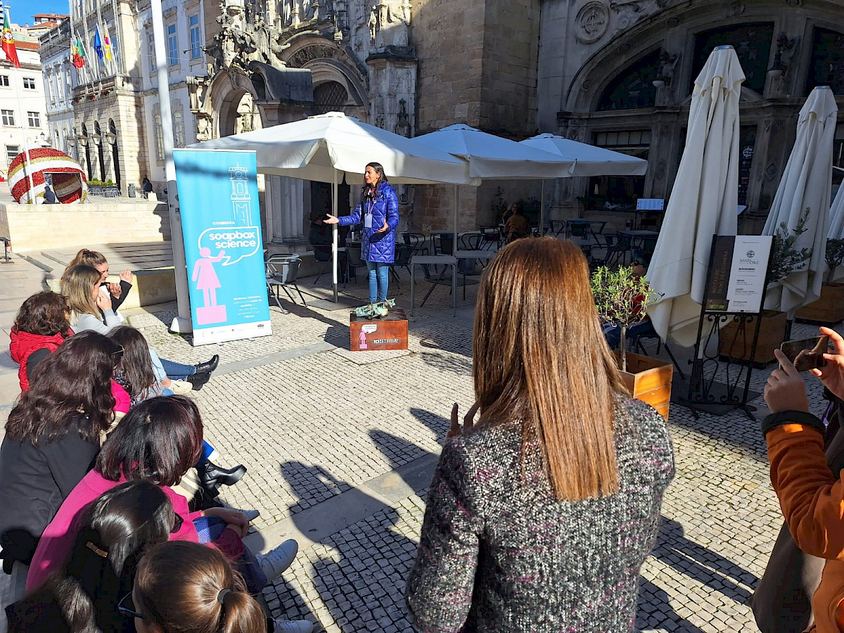 The event was held on the 23rd of November as part of the UC Science and Technology Week 2023, and was organised by the Institute for Interdisciplinary Research of the University of Coimbra (III-UC). Each of the 15 speakers had seven minutes to stand on a box in downtown Coimbra and talk about "the science they do".