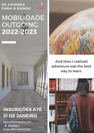 As inscrições para o Programa Erasmus+ e Outros Programas de Mobilidade da Universidade de Coimbra para o ano letivo de 2022/2023 estão abertas de 1 de dezembro de 2021 a 31 de janeiro de 2022 e são feitas online no separador "Candidaturas Mobilidade Outgoing" do Inforestudante.