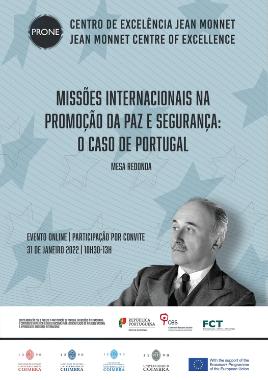 No dia 31 de janeiro de 2022 realiza-se, no âmbito do Centro de Excelência Jean Monnet, uma Mesa Redonda sobre Missões Internacionais na promoção da paz e segurança: o caso de Portugal.