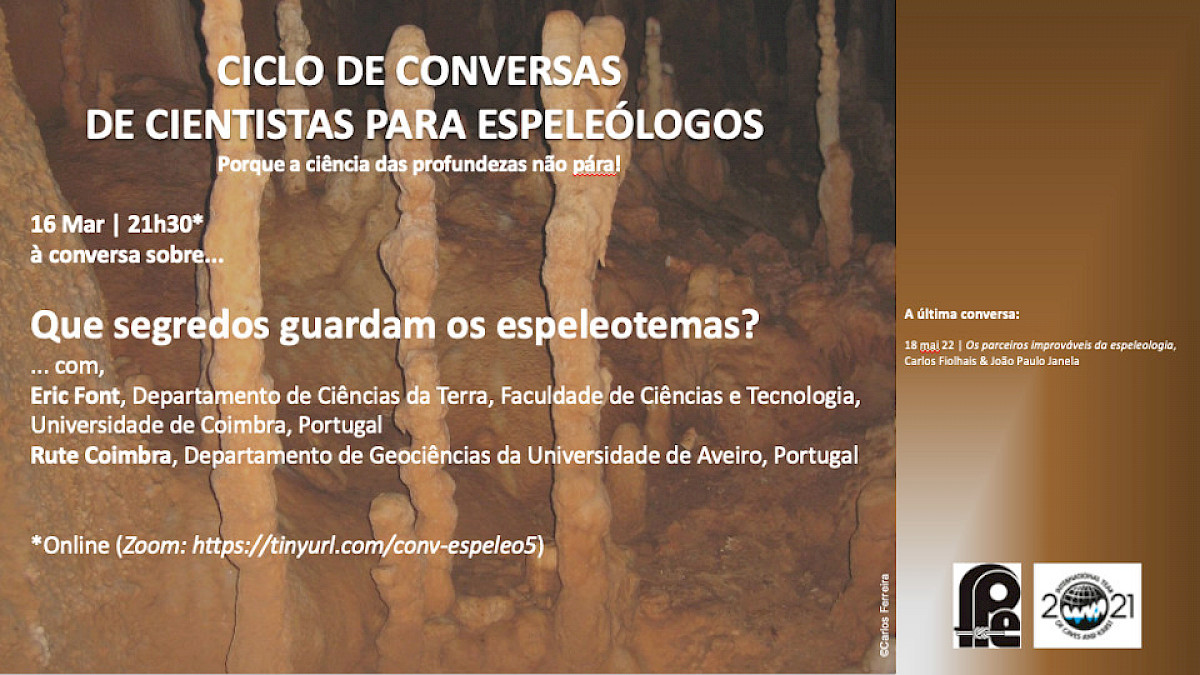 A 16 Março 2022, no âmbito do Ciclo de conferências para espeleólogos, o Prof. Eric Font fez palestra sobre espeleotemas