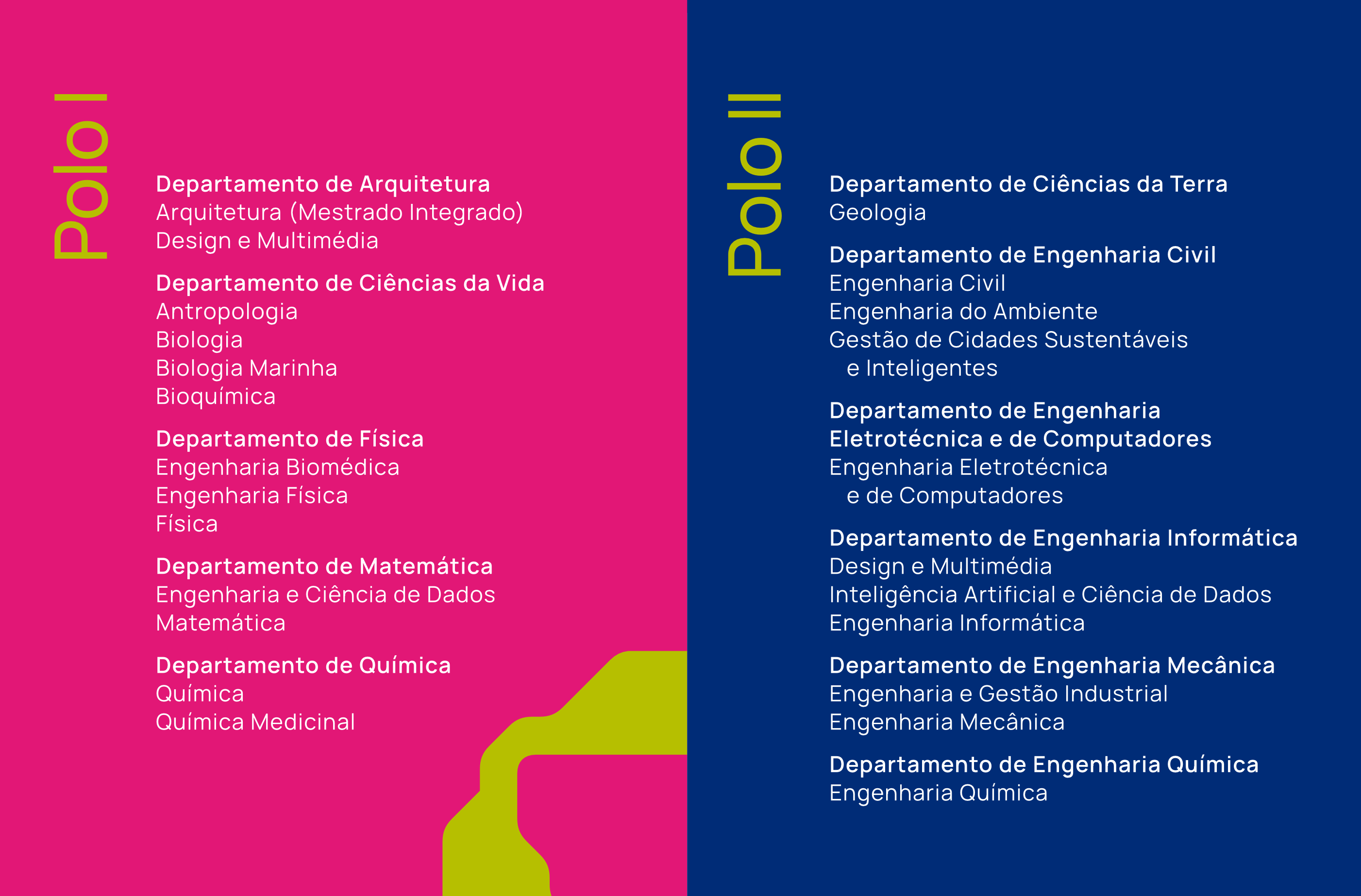 As instalações da FCTUC encontram-se em DOIS POLOS distintos, aconselhamos a consulta das licenciaturas, e mestrado integrado, leccionadas em cada um.