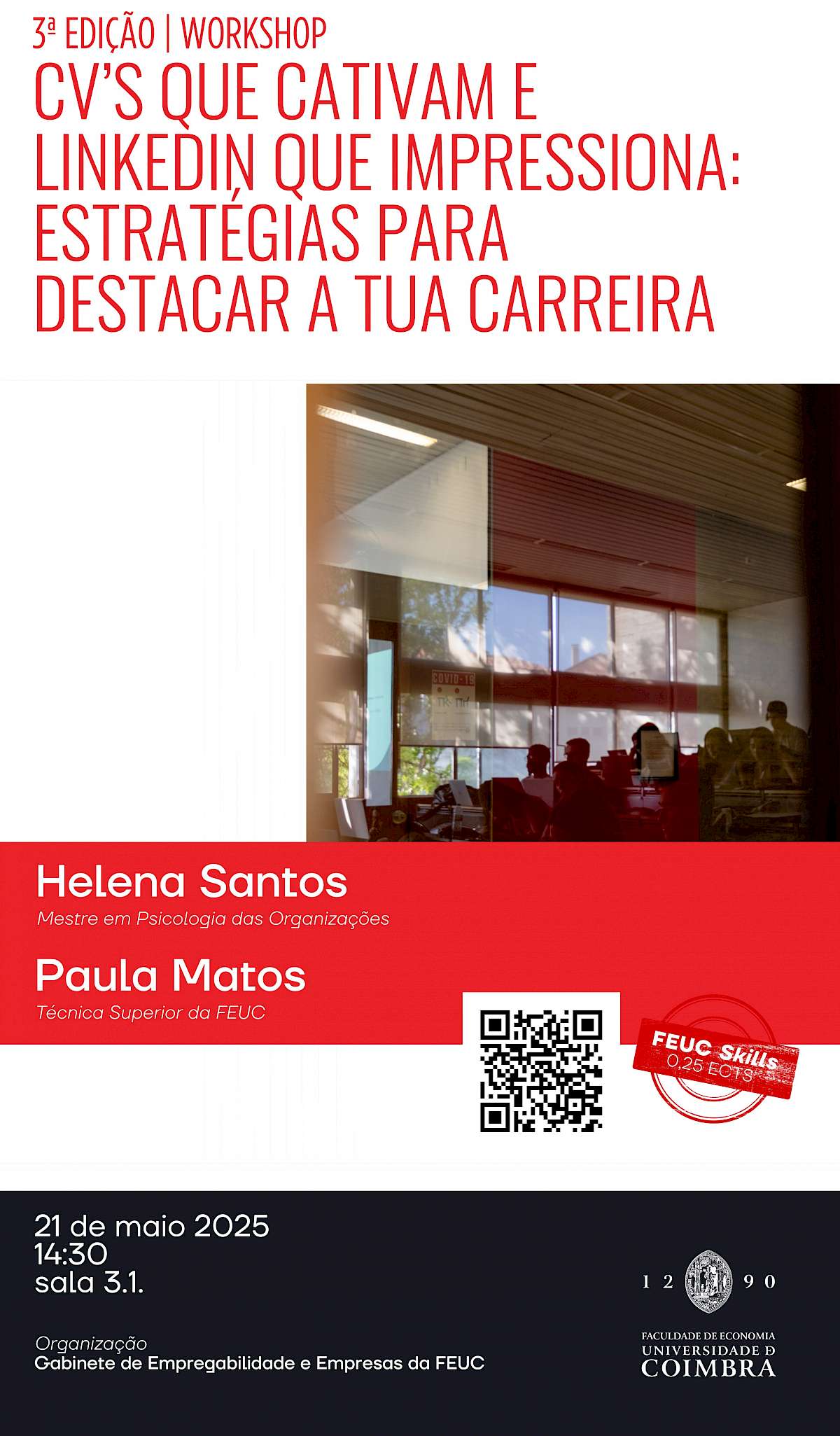 No dia 21 de maio de 2025, pelas 14h30, na sala 3.1. da Faculdade de Economia da Universidade de Coimbra (FEUC), realizar-se-á a 3º Edição do Workshop CV’s que Cativam e LinkedIn que Impressiona: Estratégias para Destacar a tua Carreira.