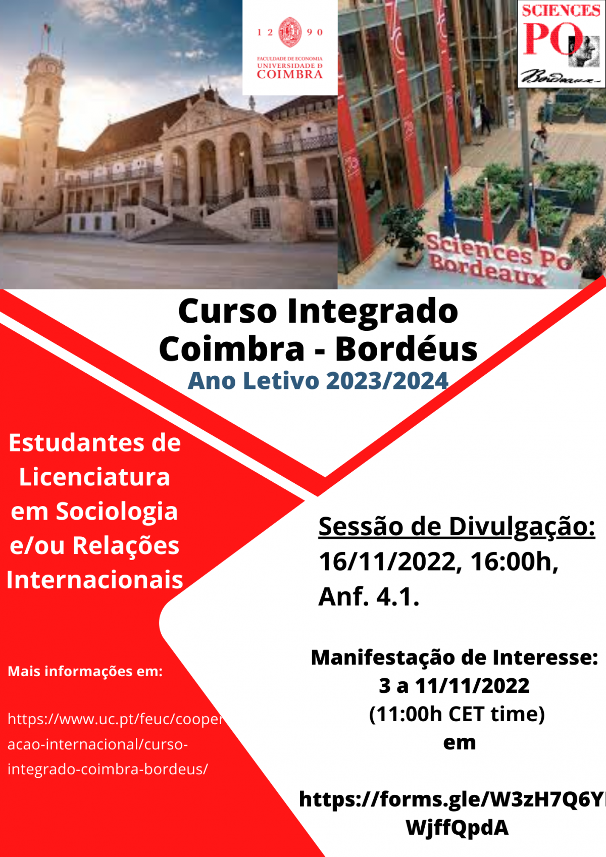 No dia 16 de novembro, às 16h, no anfiteatro 4.1 da FEUC, realiza-se uma sessão de divulgação sobre o Curso Integrado Coimbra-Bordéus (FEUC/Sciences Po-Bordéus), edição 2023/2024.