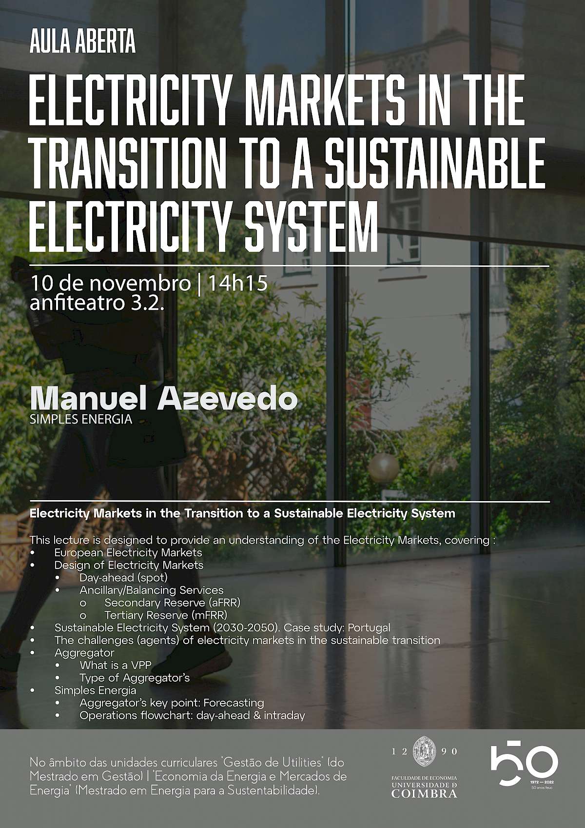 Decorre no dia 10 de novembro pelas 14h15, no anfiteatro 3.2. da Faculdade de Economia da Universidade de Coimbra, a conferência "Electricity Markets in the Transition to a Sustainable Electricity System" com Manuel Azevedo.