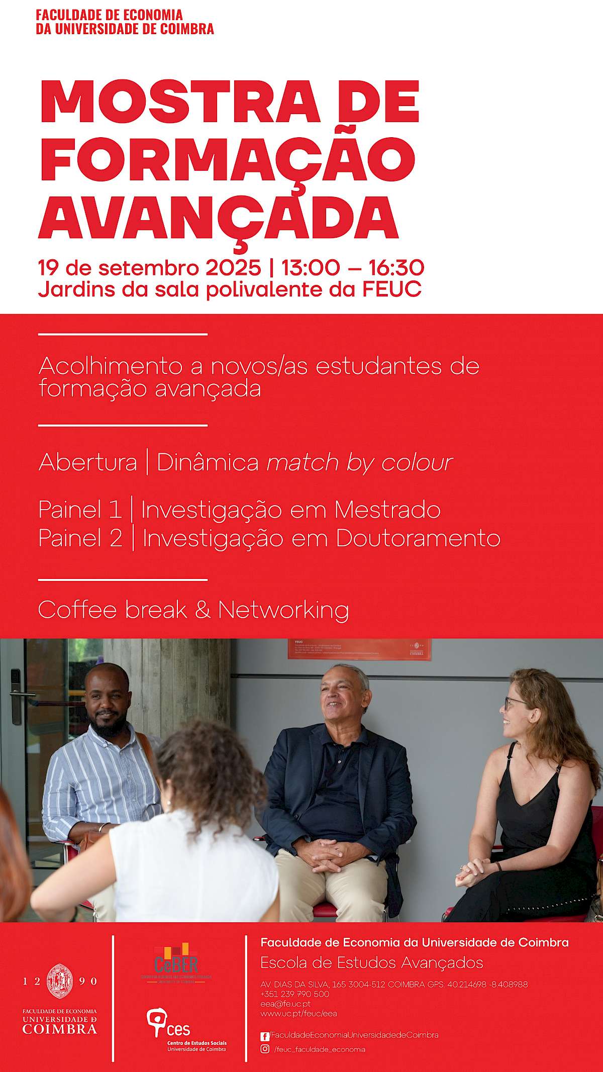 A Faculdade de Economia da Universidade de Coimbra convida toda a comunidade académica a participar na Mostra de Formação Avançada, um evento de acolhimento dirigido a novos estudantes de Pós-graduação, Mestrado e Doutoramento.