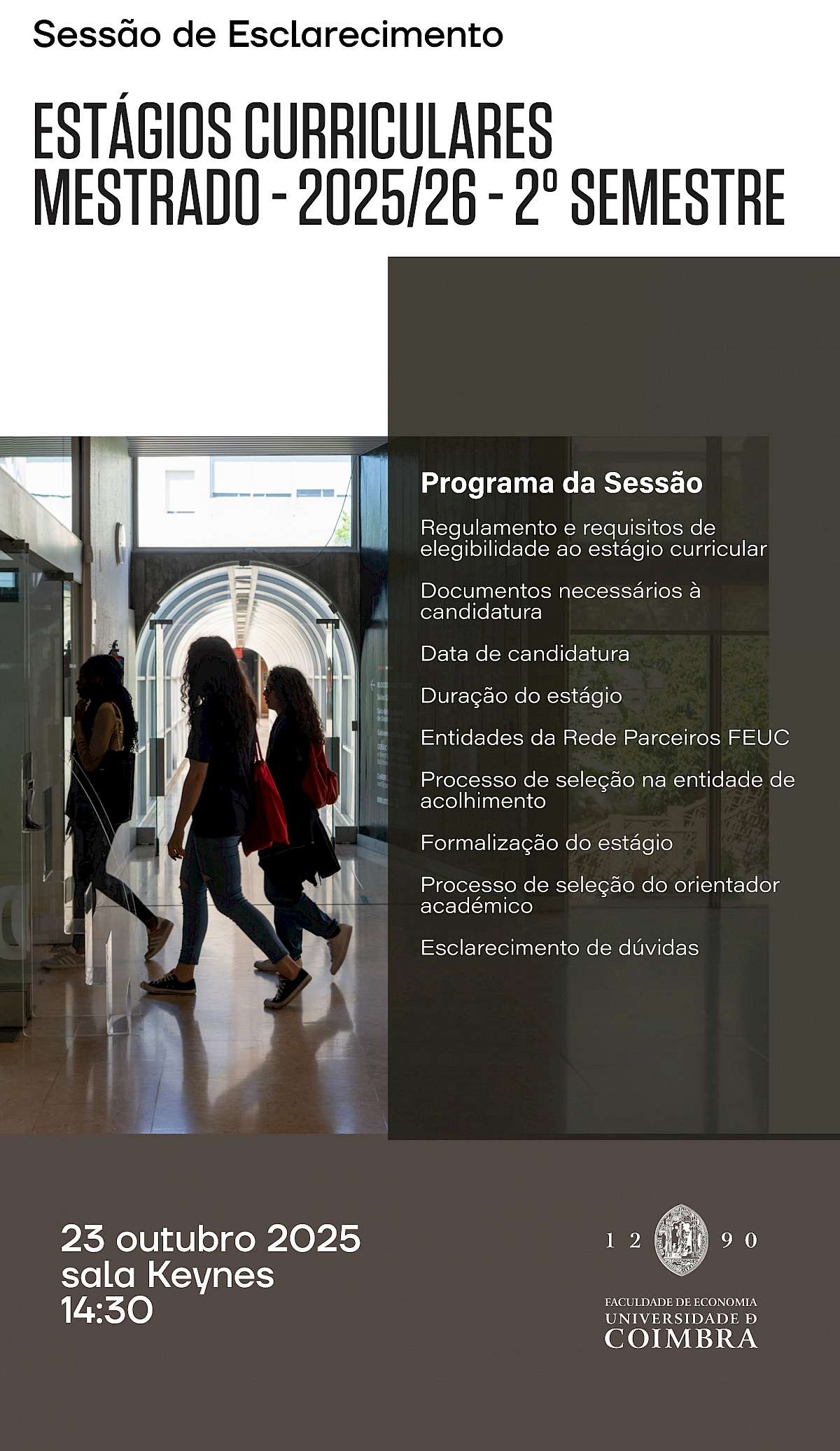 No próximo dia 23 de outubro (5ª feira), decorrerá na Sala Keynes., pelas 14:30h, a Sessão de Esclarecimentos Estágios Curriculares do 2º semestre - 2025-26.