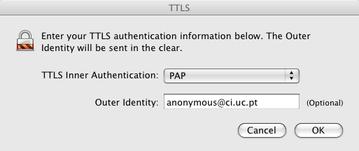 - Escolher o TTLS Inner Authentication PAP. Como Outer Identity deve-se colocar anonymous@student.uc.pt ou anonymous@uc.pt