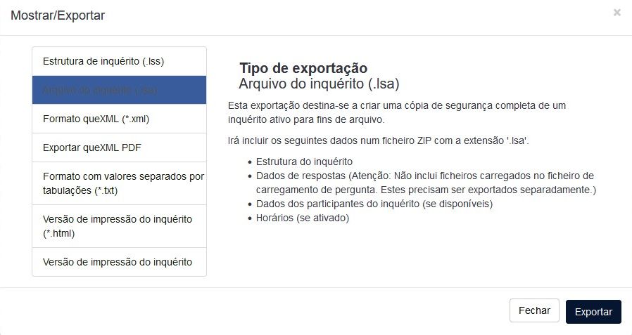 2a) Se o inquérito a exportar estiver no estado ativo ou expirado e quiser exportar também as respostas escolha o formato .lsa (LimeSurvey Archive).