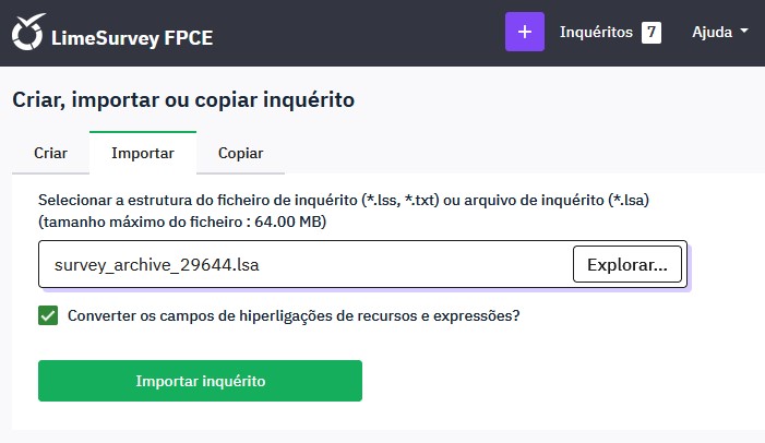 2b) Se o inquérito estiver desativado utilize o formato .lss (LimeSurvey Structure)