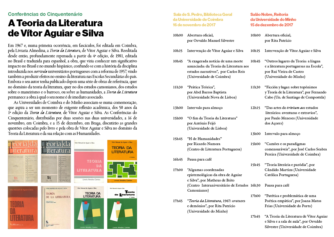 CONFERÊNCIAS DO CINQUENTENÁRIO. A TEORIA DA LITERATURA DE VÍTOR AGUIAR E SILVA Coimbra, 16 de Novembro de 2017 | Braga, 15 de Dezembro de 2017 Por ocasião dos 50 anos da publicação da Teoria da Literatura, de Vítor Aguiar e Silva, a Universidade de Coimbra e a Universidade do Minho promoveram as “Conferências do Cinquentenário”. O CIEC colaborou na organização deste evento, em parceria com a Reitoria da Universidade de Coimbra, a Faculdade de Letras da Universidade de Coimbra, o Centro de Literatura Portuguesa, a Reitoria da Universidade do Minho, o Instituto de Letras e Ciências Humanas da Universidade do Minho e o Centro de Estudos Humanísticos. Em 1967 e, numa primeira ocorrência, em fascículos, foi editada em Coimbra, pela Livraria Almedina, a Teoria da Literatura, de Vítor Aguiar e Silva. As Conferências do Cinquentenário, distribuídas por duas sessões nas duas universidades, a 16 de novembro, em Coimbra, e a 15 de dezembro, em Braga, discutiram as grandes questões colocadas pelo livro e pela obra de Vítor Aguiar e Silva no domínio da Teoria da Literatura e da sua relação com as Humanidades. | ![]() |