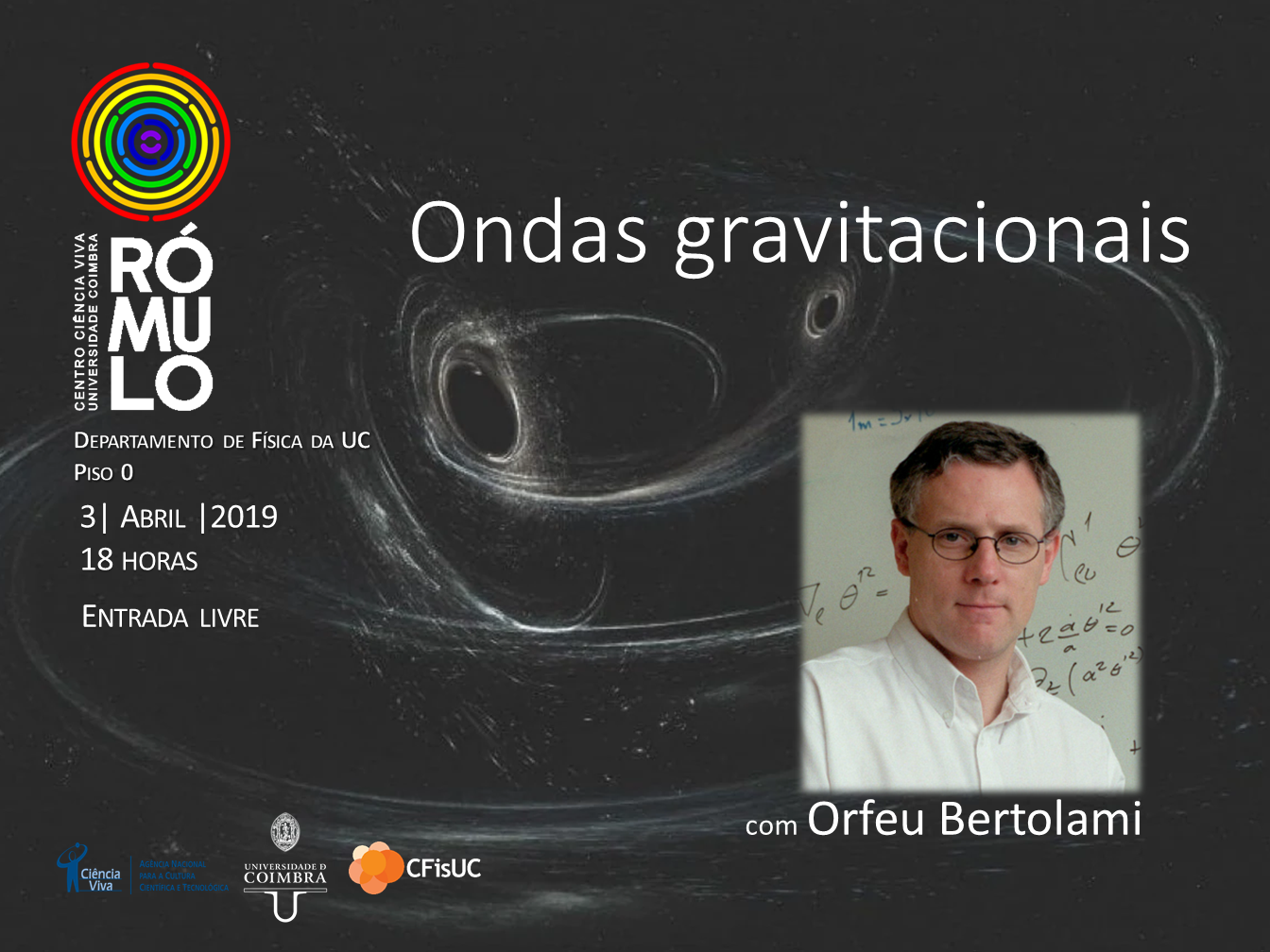 Na próxima 4ª feira, dia 3 de Abril de 2019, tem lugar no RÓMULO Centro Ciência Viva da Universidade de Coimbra a palestra "Ondas gravitacionais", com Orfeu Bertolami, Professor catedrático no Departamento de Física e Astronomia da Faculdade de Ciências da Universidade do Porto.