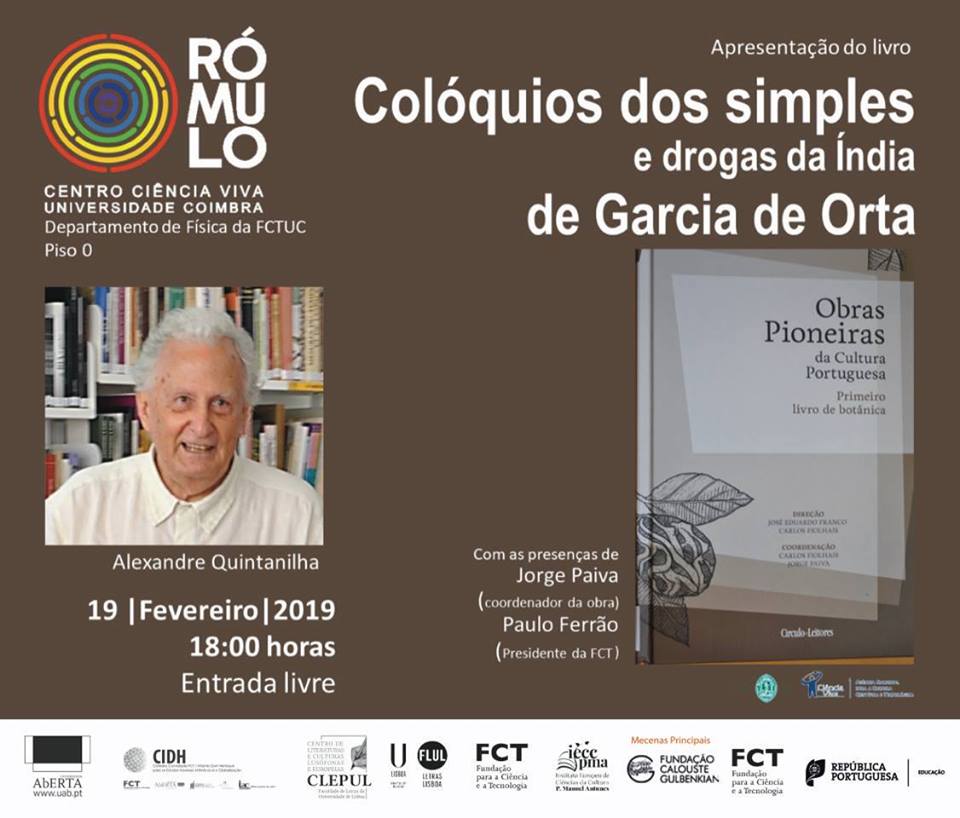 Na 3ª feira, dia 19 de Fevereiro de 2019 às 18h, tem lugar no RÓMULO - Centro Ciência Viva da Universidade de Coimbra a apresentação do 15º volume das Obras Pioneiras da Cultura Portuguesa, "Primeiro Livro de Botânica" que contem "Colóquios dos simples e drogas da Índia , do século XVI, da autoria de Garcia de Orta.