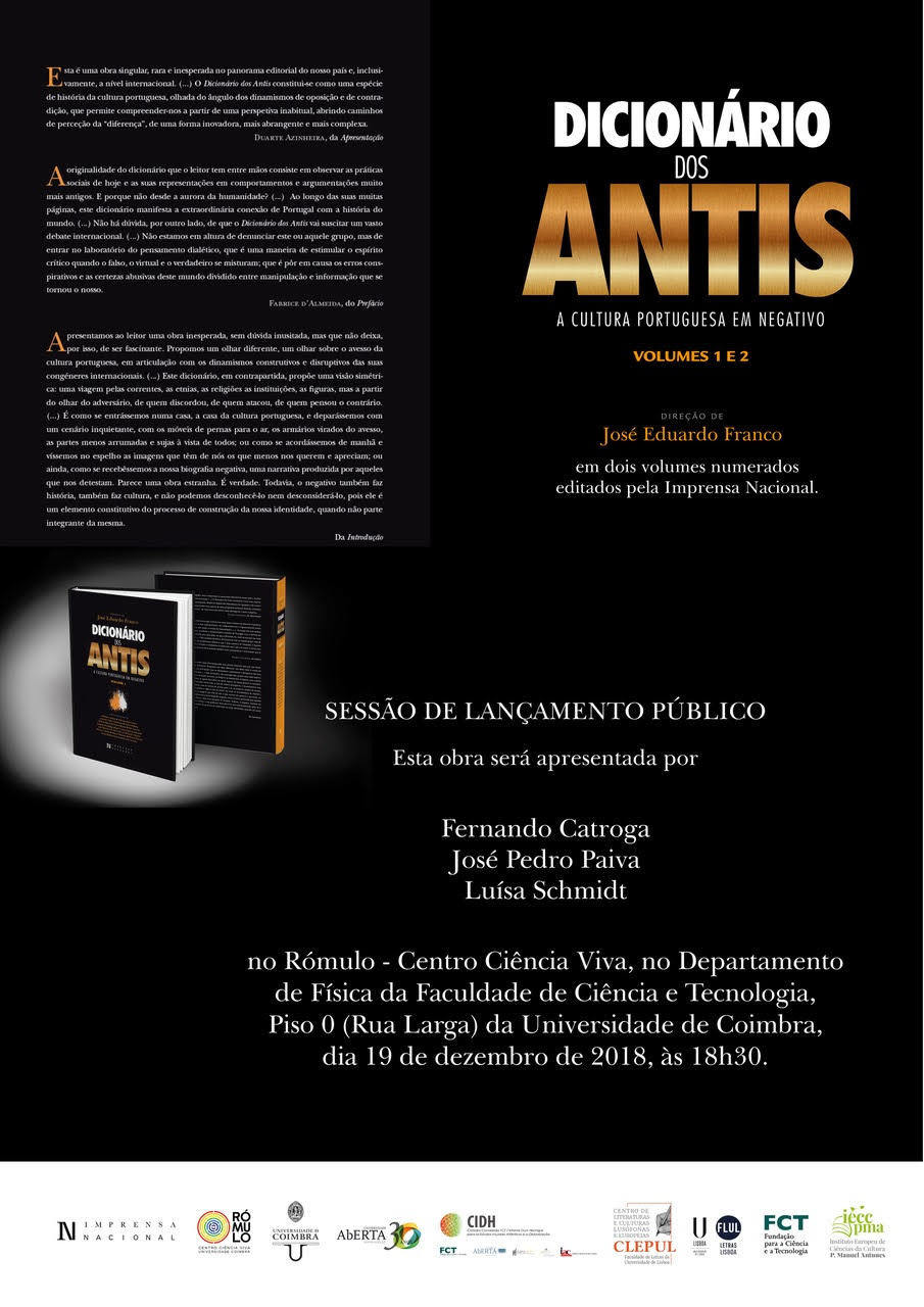 No dia 19 de Dezembro de 2018, às 18.30h, haverá uma sessão pública de lançamento da obra "Dicionário dos Antis - A Cultura Portuguesa em Negativo", obra recém publicada dirigida pelo Professor José Eduardo Franco e que será apresentada por Fernando Catroga, José Pedro Paiva e Luísa Schmidt.
