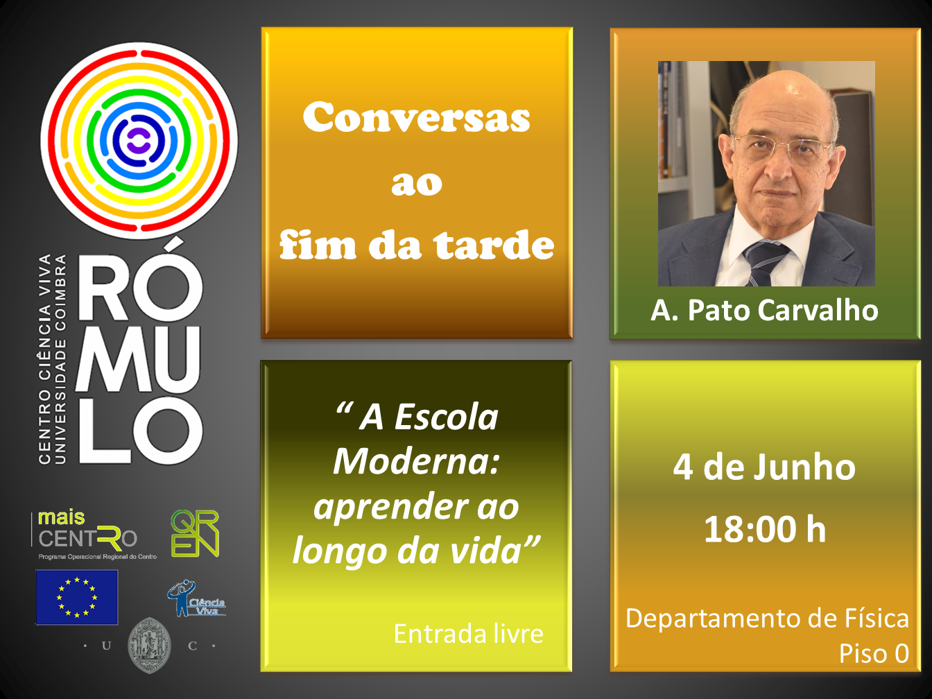 No próximo dia 4 de Junho de 2013, pelas 18:00h, no RÓMULO – Centro Ciência Viva da Universidade de Coimbra, localizado no Departamento de Física da Universidade de Coimbra, terá lugar mais uma “Conversa ao fim da tarde”, com “Arsélio Pato de Carvalho” professor jubilado de Biologia da Universidade de Coimbra e Director do Instituto de Educação e Cidadania da Mamarrosa, que falará sobre “A Escola Moderna: aprender ao longo da vida”.