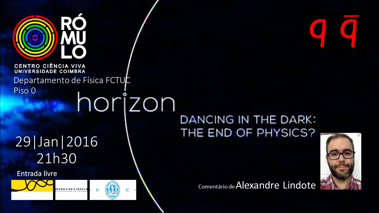 Na próxima sexta-feira, 29 de Janeiro de 2016 às 21.30 realiza-se no RÓMULO Centro Ciência Viva da Universidade de Coimbra a exibição do documentário da série Horizon da BBC "Dancing in the dark: the end of physics?", comentado por Alexandre Lindote, no âmbito do Projecto Quark! - Escola de Físíca para Jovens.