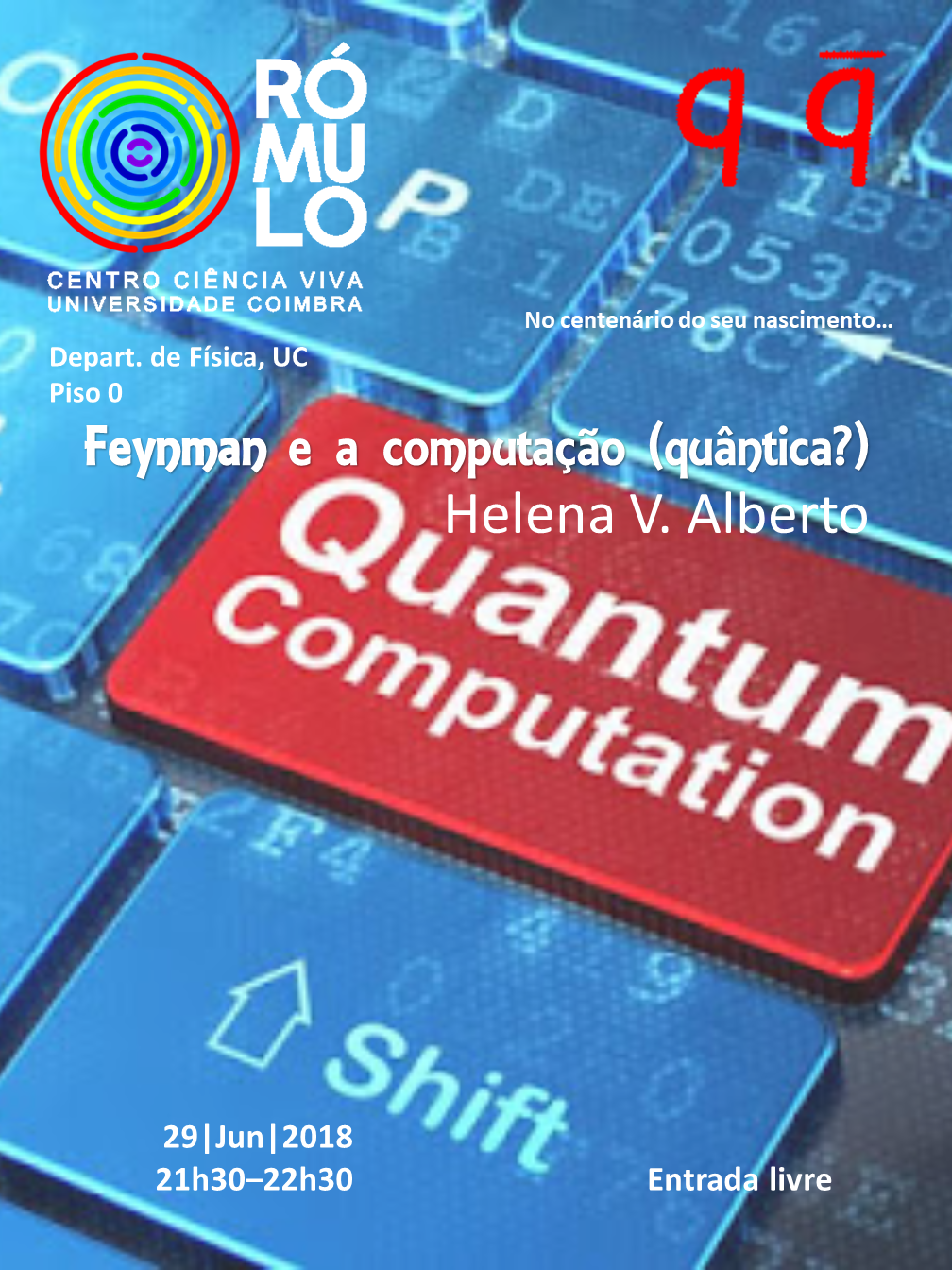 Na próxima 6ª feira, dia 29 de Junho de 2018, pelas 21.30, no âmbito do Projecto Quark! - Escola de Física para Jovens, este ano dedicado ao centenário do nascimento de Richard Feynman, terá lugar no RÓMULO - Centro Ciência Viva Universidade Coimbra a palestra "Feynman e a computação" com a Professora Helena V. Alberto.