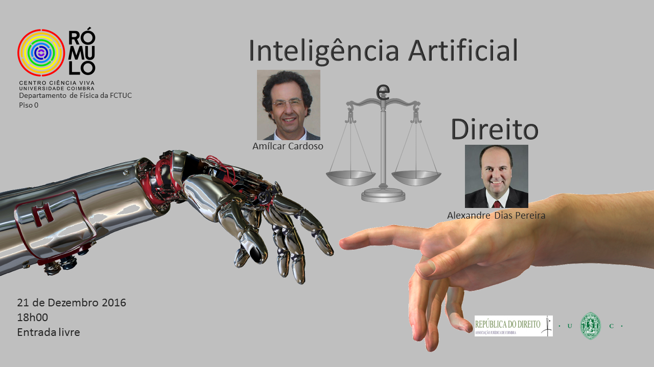Na próxima 4ª feira, 21 de Dezembro de 2016, às 18.00h, realiza-se no RÓMULO Centro Ciência Viva da Universidade de Coimbra, a palestra "Inteligência Artificial e Direito", com Amílcar Cardoso, professor do Centro de Informática e Sistemas da Universidade de Coimbra e Alexandre Dias Pereira, professor da Faculdade de Direito da Universidade de Coimbra.
