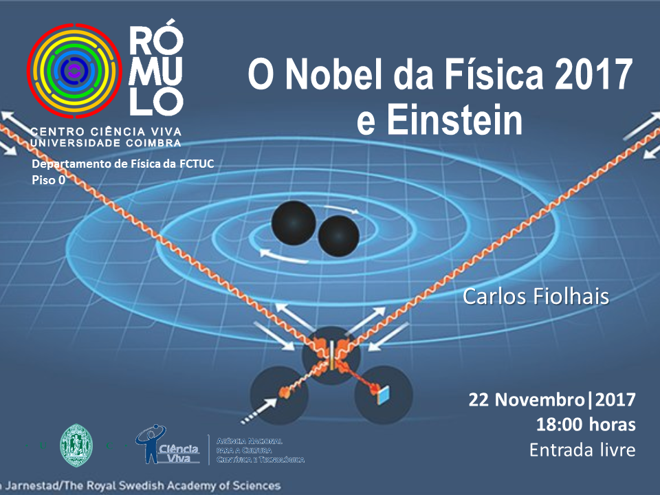 Na próxima 4ª feira, dia 22 de Novembro de 2017, às 18.00h, no âmbito de mais uma Semana da Ciência e Tecnologia, realiza-se no RÓMULO Centro Ciência Viva da Universidade de Coimbra, a palestra "O Prémio Nobel da Física 2017 e Einstein" com Carlos Fiolhais, Professor do Departamento de Física da Faculdade de Ciências e Tecnologia da Universidade de Coimbra e director do Rómulo CCVUC.
