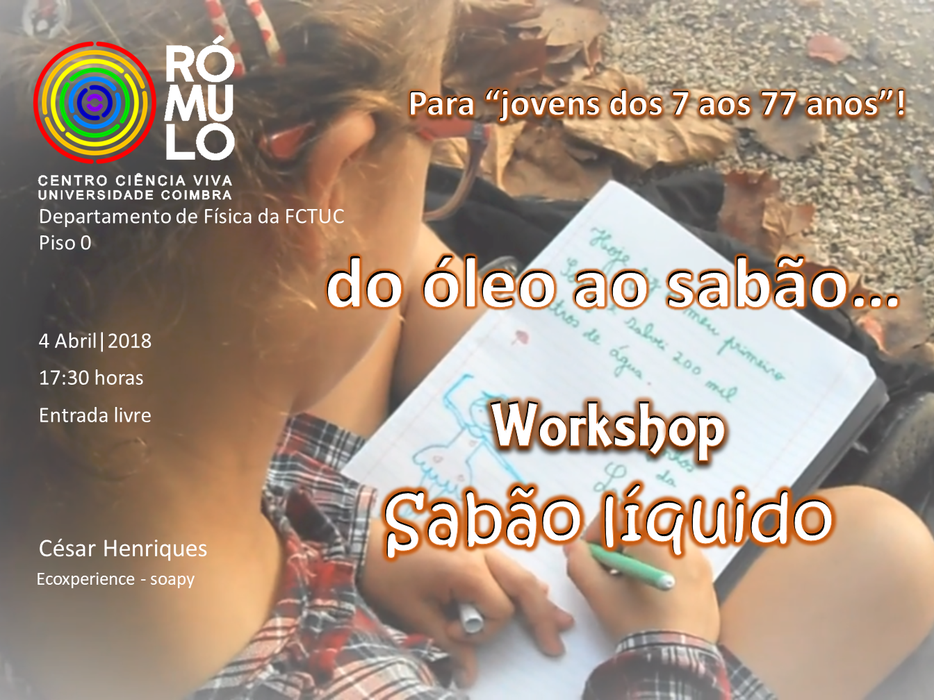 Na próxima 4ª-feira, dia 4 de Abril de 2018, às 17.30 tem lugar no RÓMULO Centro Ciência Viva da Universidade de Coimbra o Workshop "Sabão líquido : do óleo ao sabão" com César Henriques da EcoXperience.