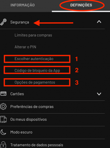3. Nas Definições, na secção Segurança deve configurar as opções: Escolher autenticação (1), Código de bloqueio da App (2) e Opções para Pagamentos (3)