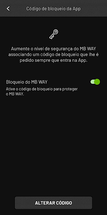 - Código de bloqueio da App: Ative a opção Bloqueio do MB WAY. De seguida surge outra janela para definir o código de bloqueio