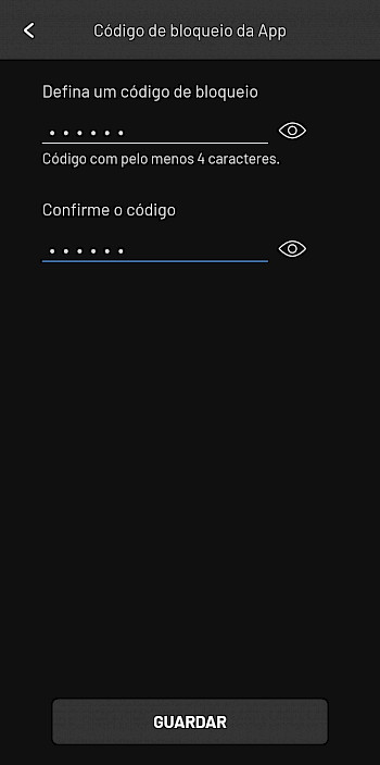 - Escolher autenticação: ative Impressão digital ou reconhecimento facial. (Nota: esta opção deve estar configurada nas definicões dos Dados Biométricos do seu telemóvel)