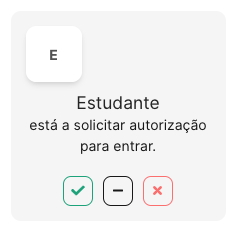 Caso o pedido surja em momento que o docente entenda não ser oportuno (para decidir pela autorização de acesso), será possível minimizá-lo. Depois de o pedido minimizado, o docente poderá continuar a controlar/regrar a sua sessão normalmente. A qualquer momento, poderá dar seguimento ao pedido de entrada pendente.