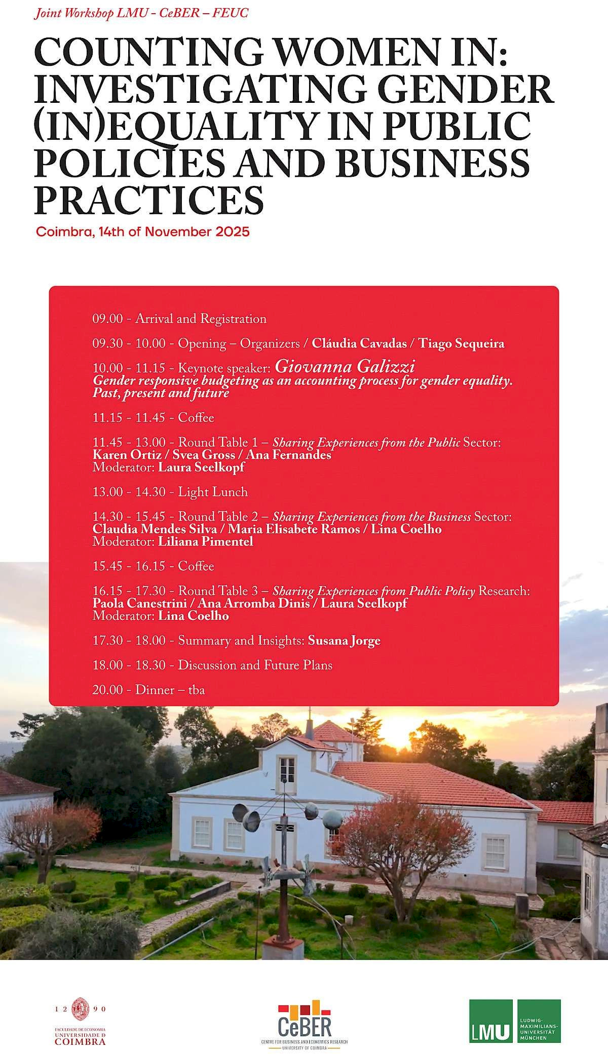 No dia 14 de novembro de 2025, o CeBER e a FEUC, em colaboração com a Ludwig-Maximilians-Universität München (LMU), recebe o workshop internacional “Counting Women In”, um encontro interdisciplinar dedicado à reflexão sobre as desigualdades de género nas políticas públicas e nas práticas empresariais.