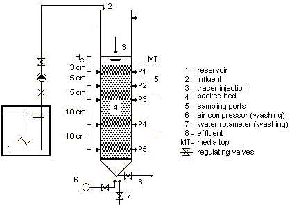 Biological filtration through submerged packed bed is a technology that has been recently integrated in control and management of water and soil pollution. Scaled-up packed bed reactors, however, bring lower yields than expected. One of the main causes of lower performance of filters is related to poor liquid distribution which affects the distribution of both incoming substrates and reaction products. The main factors involved in flow maldistribution is the presence of immobile areas, dead volumes, short-circuiting, internals recirculation, and dispersion. A study on the hydraulic characteristics of a submerged packed bed is an accurate procedure to get information about the presence of these flow disturbances.